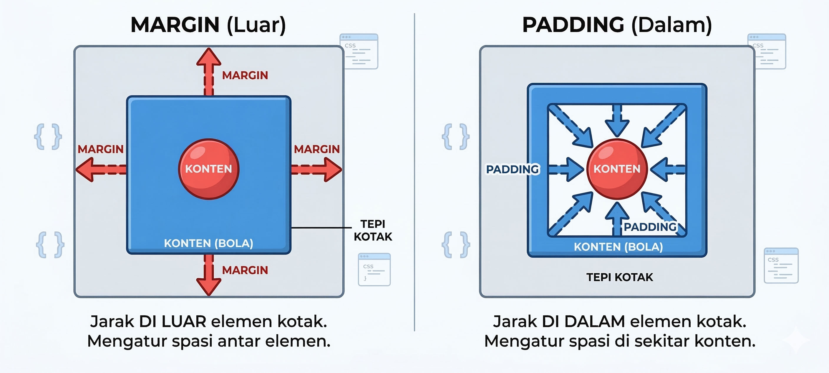 - Margin: Ruang kosong di luar elemen. Digunakan untuk memberi jarak antar elemen agar tidak berdempetan.